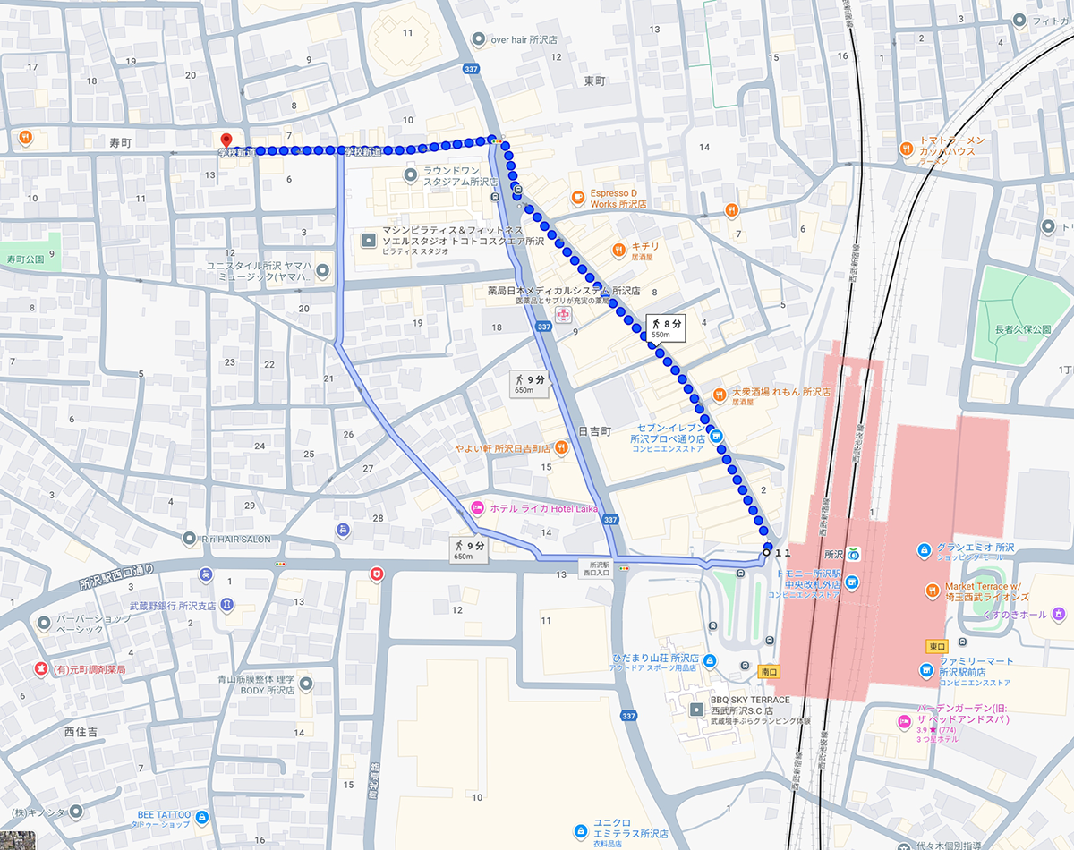 所沢駅西口からの行き方をGoogleMAPで表示する